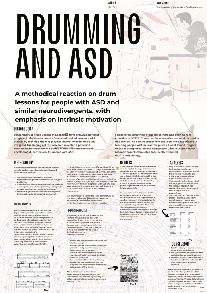 In order to create his drum methodology for people with autism and similar neurodivergents, Guy conducted research in collaboration with Stichting Tamino, Stichting Wim de Monchy and Conservatorium van Amsterdam. Guy conducted a study with students at Orion College, Amsterdam, of which the research paper was released in june 2024. A brief summary of this research can be read here: